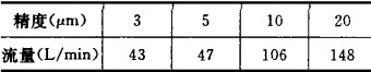 過(guò)濾精度對(duì)Y型過(guò)濾器所通過(guò)流量的影響是相當(dāng)大的,同一型號(hào)的過(guò)濾器當(dāng)其選用不同精度濾芯時(shí),其通過(guò)流量也不同。由于受濾材結(jié)構(gòu)、濾芯制作工藝等因素的影響,精度與流量之間沒(méi)有固定的比例變化關(guān)系,但一般來(lái)說(shuō),過(guò)濾精度越高,其通過(guò)的流量越小。表1所示為某廠一標(biāo)準(zhǔn)型號(hào)產(chǎn)品,當(dāng)其精度變化時(shí)流量變化的數(shù)據(jù)。從表中可以看出精度變化對(duì)流量的影響是非常大的,這也是高精度Y型過(guò)濾器經(jīng)常發(fā)生流量不夠的主要原因。